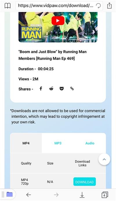 Open YouTube on your iOS device and find the Running Man episode you want to download, then just copy its URL and paste to the download bar on VidPaw's main interface in Documents. Then VidPaw will resolve the URL. When VidPaw shows the output selections, choose one for downloading the Running Man episode by hitting Download button on the right.